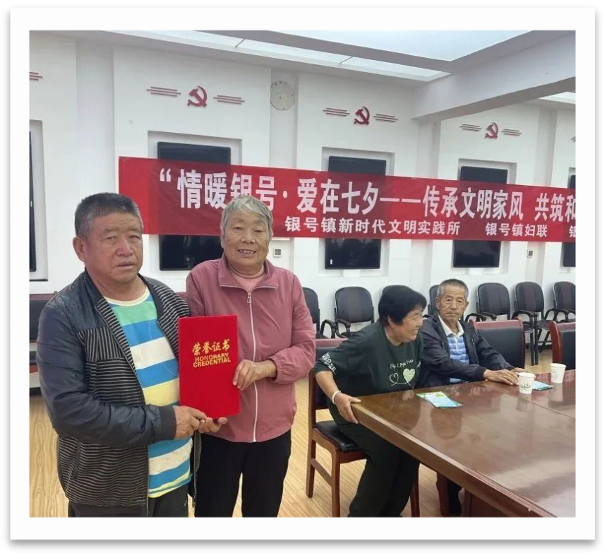 “最美家风”故事汇环节,2对银婚夫妻代表用朴实的语言分享婚姻经营与家庭和睦的秘诀。“那时候种地靠人力,他白天扛锄头,晚上还帮我缝补衣服;我身子弱,他总把白面馒头留给我和孩子。”一位阿姨的讲述勾起了在场群众的共同记忆,夫妻俩在农耕劳作、育儿持家中互帮互助、共渡难关的故事,引得台下阵阵掌声。同时表彰了“银号镇好家风家庭”,为获奖家庭颁发荣誉证书,将“孝老爱亲、勤俭持家”的家风理念传递给每一位参与者。